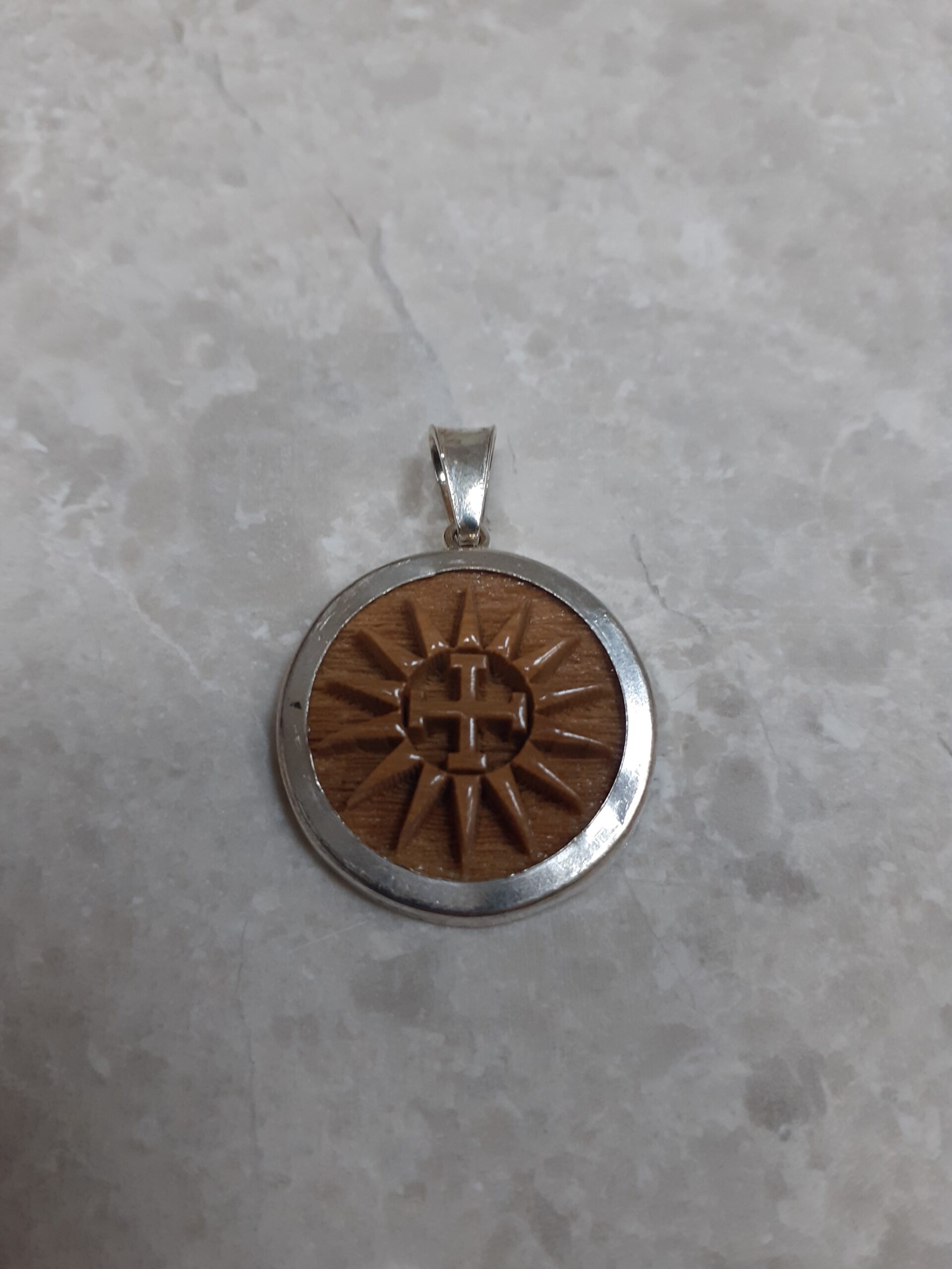The pendant features 0.8 grams of locally sourced olive wood, encased in a substantial 1-gram setting of genuine Silver 925. Measuring a delicate yet noticeable 2.3 cm in diameter.